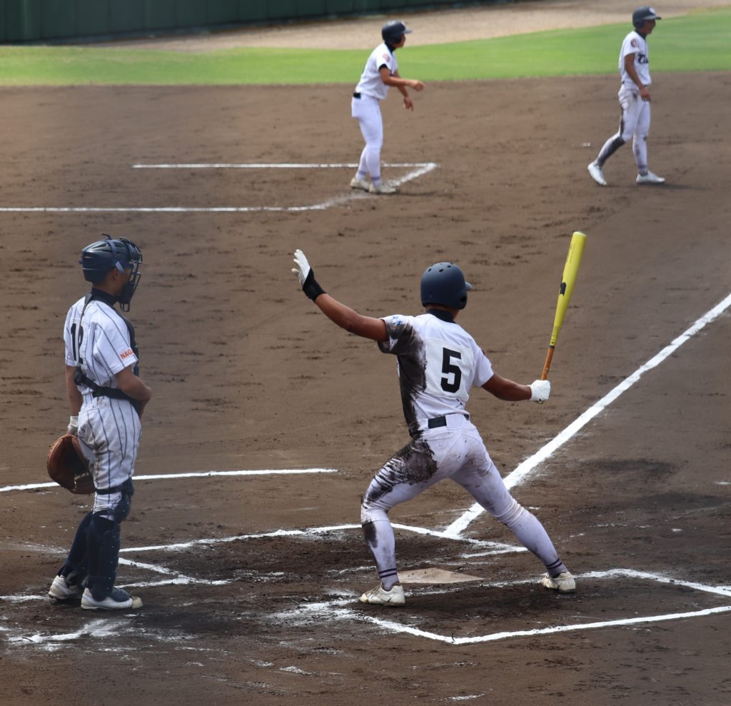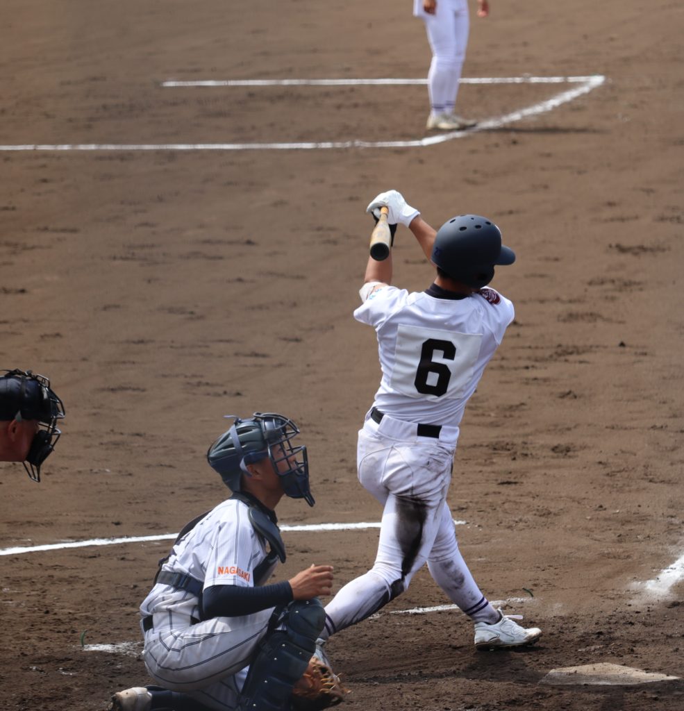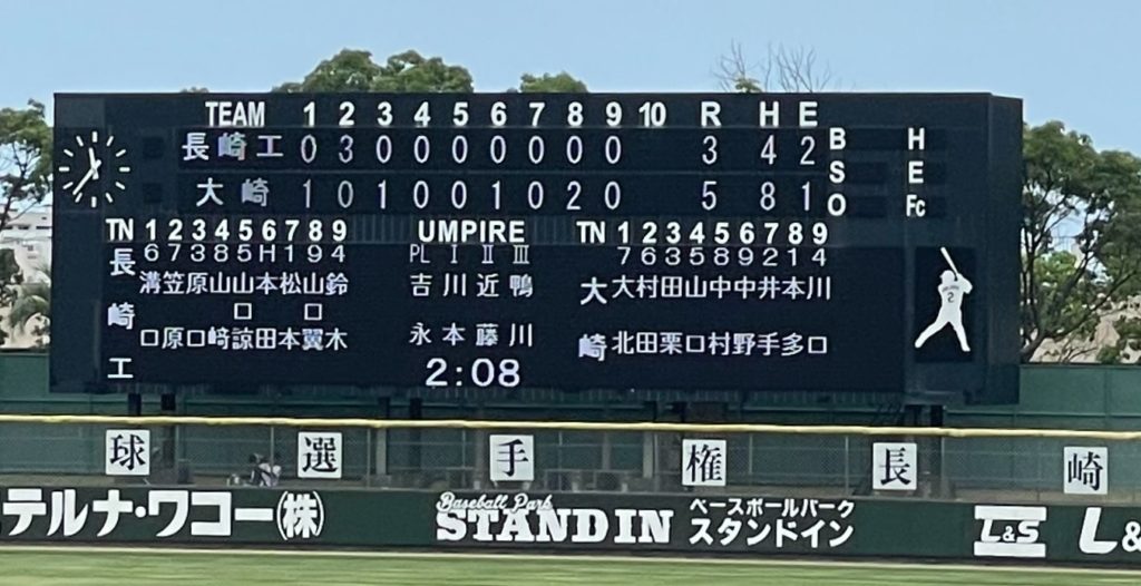序盤大崎は制球が定まらない長崎商投手から四球を選び、走者を出すも得点を上げる事ができず5回まで2安打、外野へ抜けそうな打球を好捕されるなど得点を上げることができません。