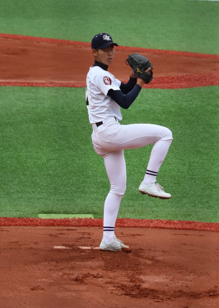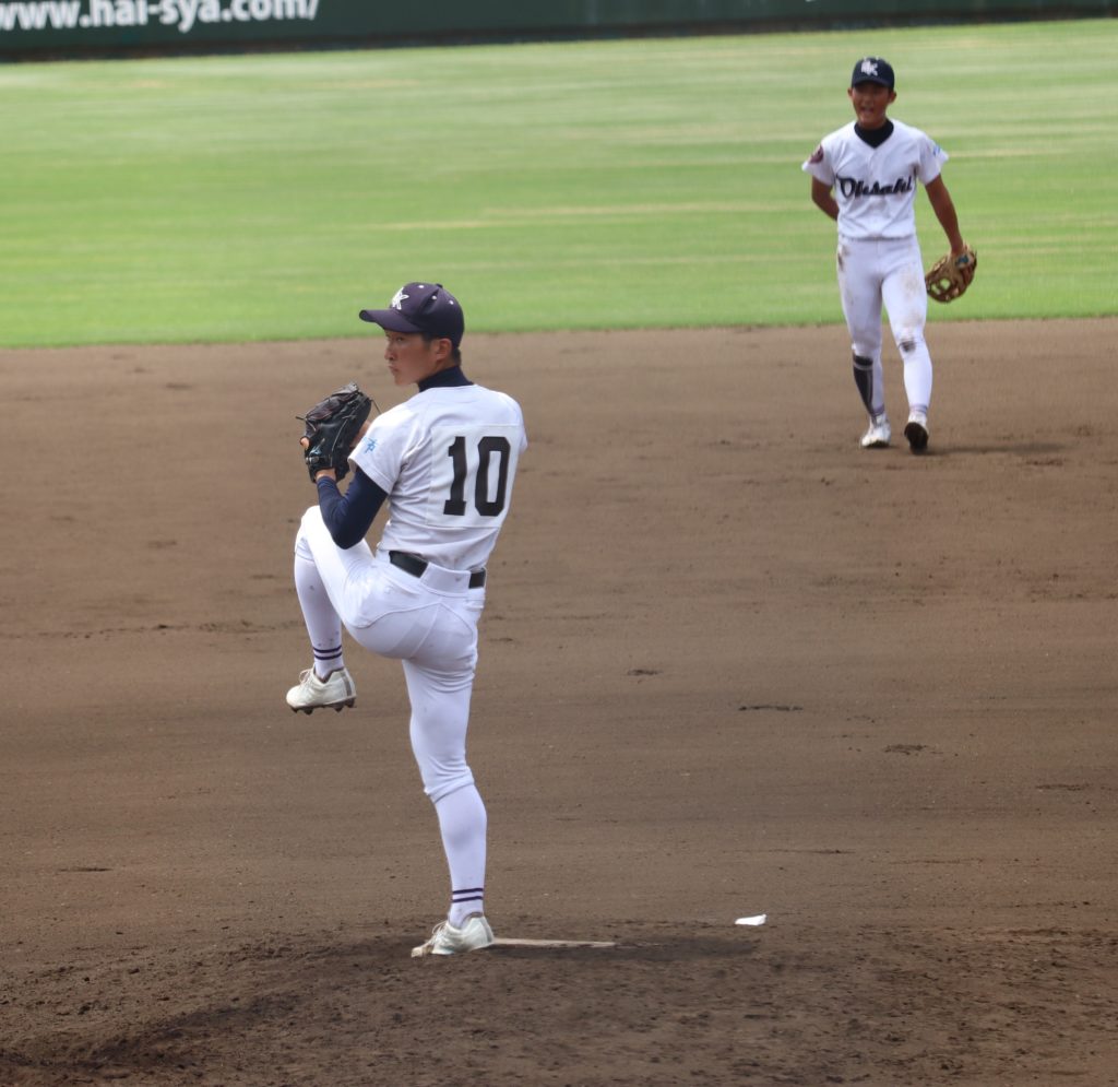 大崎は本大会初登板のエースナンバーを背負った勝本と井手が、公式戦初めてのバッテリーを組みます。立ち上がり1,2回は相手に安打を許しますが3奪三振と要所を締め、無得点に抑えます。
