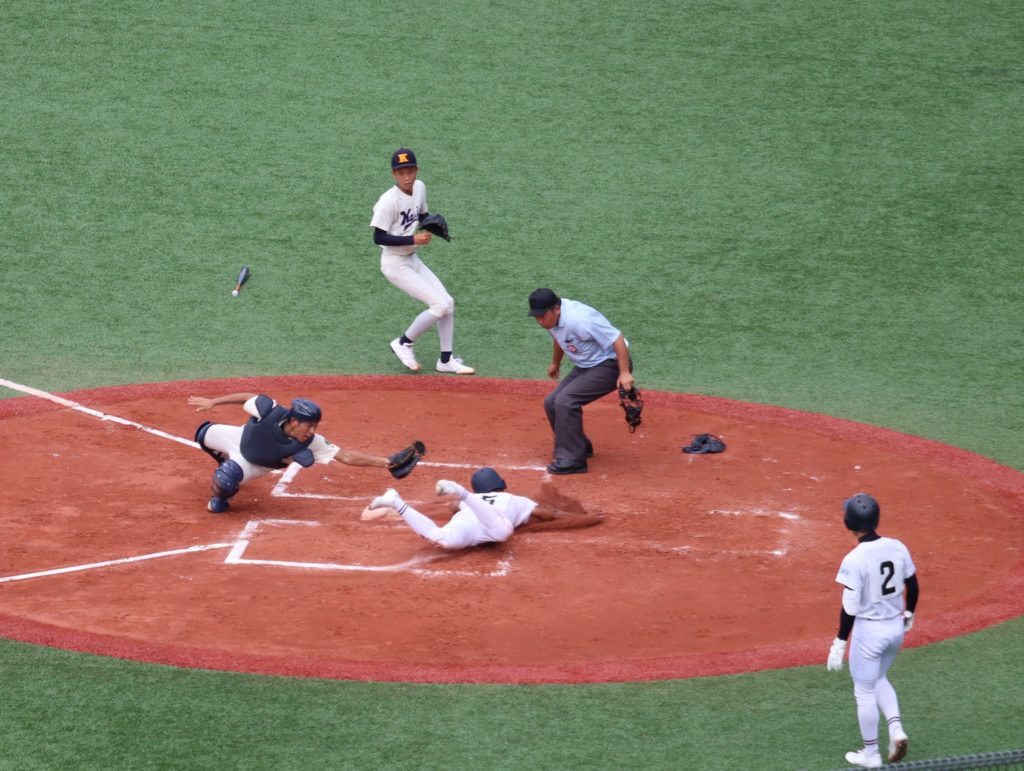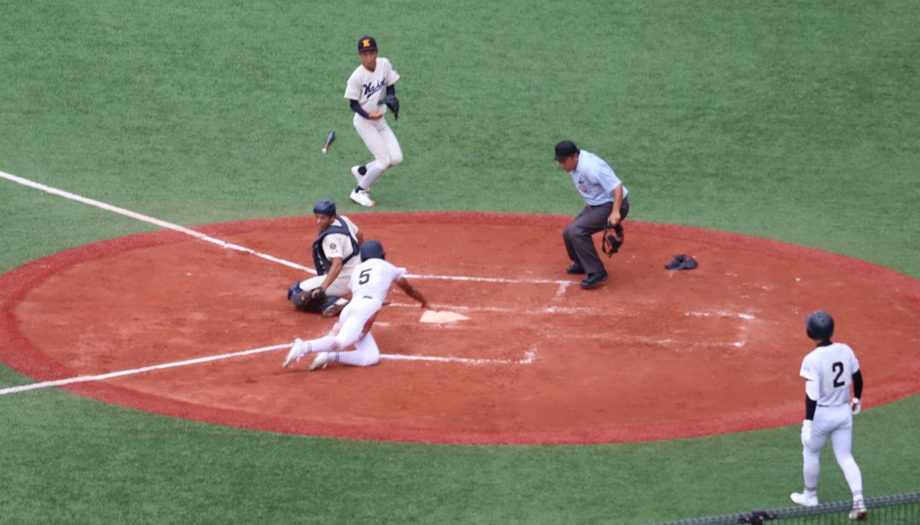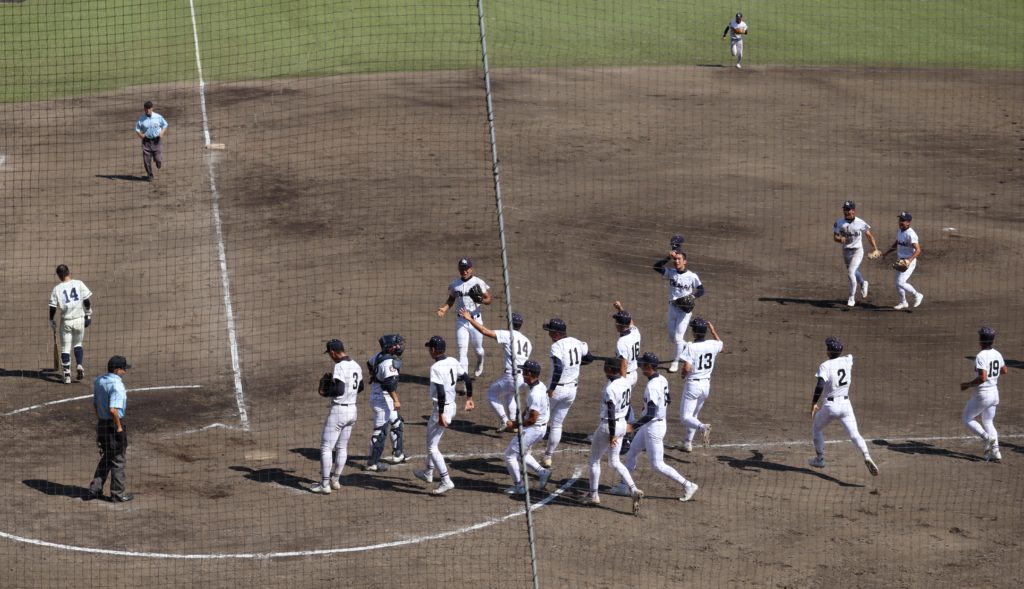 続く2回も海星は連続安打から一死二、三塁とし、三本間の走者挟殺で不運にも送球が走者に当たり、本塁生還で0-2とリードを広げられます。