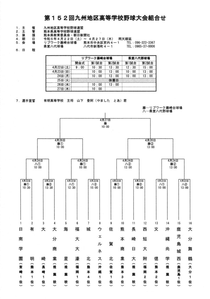 大崎高校は、第152回九州地区高校野球長崎県大会決勝戦(4月9日開催)で創成館に勝利し、2020年秋以来 5季ぶり、4度の優勝を飾りました。この優勝で、大崎高校は、4月22日から熊本県で開催される九州大会に出場します。九州大会の1回戦は4月22日(土)13時30分から「リブワーク藤崎台球場」で、大分商業と対戦します。