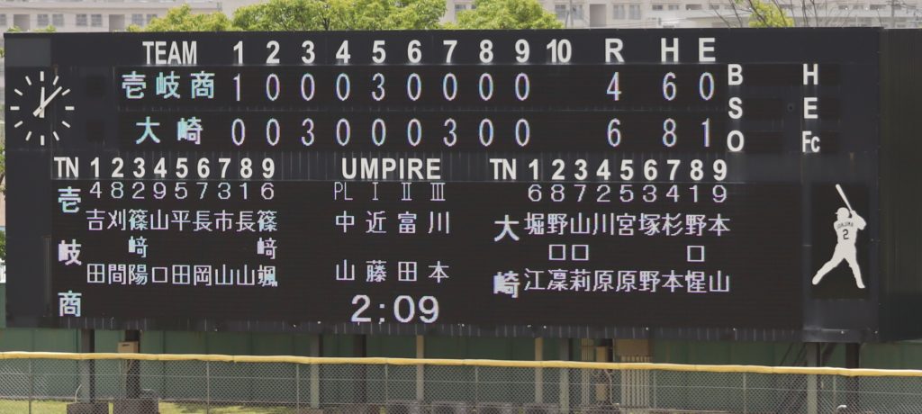 大崎は6回から登板した野口惺恩選手が、被安打2 奪三振5と3塁を踏ませない見事な投球で、壱岐商業打線に追加点を与えず、試合の主導権を壱岐商業に与えませんでした。 野口惺恩選手のテンポ良い投球は、攻撃陣に刺激を与え、7回裏 一死後 1番打者 堀江選手 2番打者 野口凛空選手の連続2塁打で1点を返し4対4の同点。その後、山口莉貢選手 川原選手 宮原選手の中軸が3連続四死球で5対4と再逆転。6番打者 塚野選手の左犠飛で6点目を奪い、6対4と逆転しました。