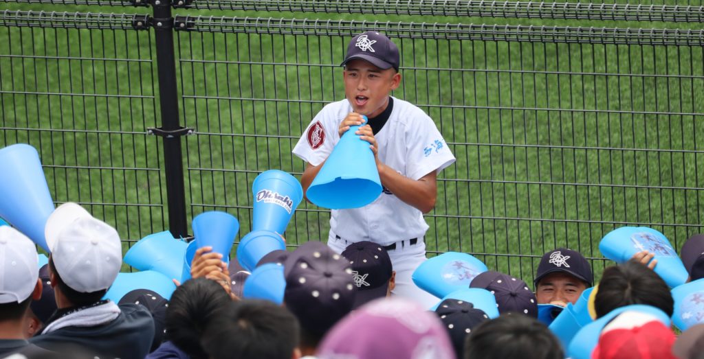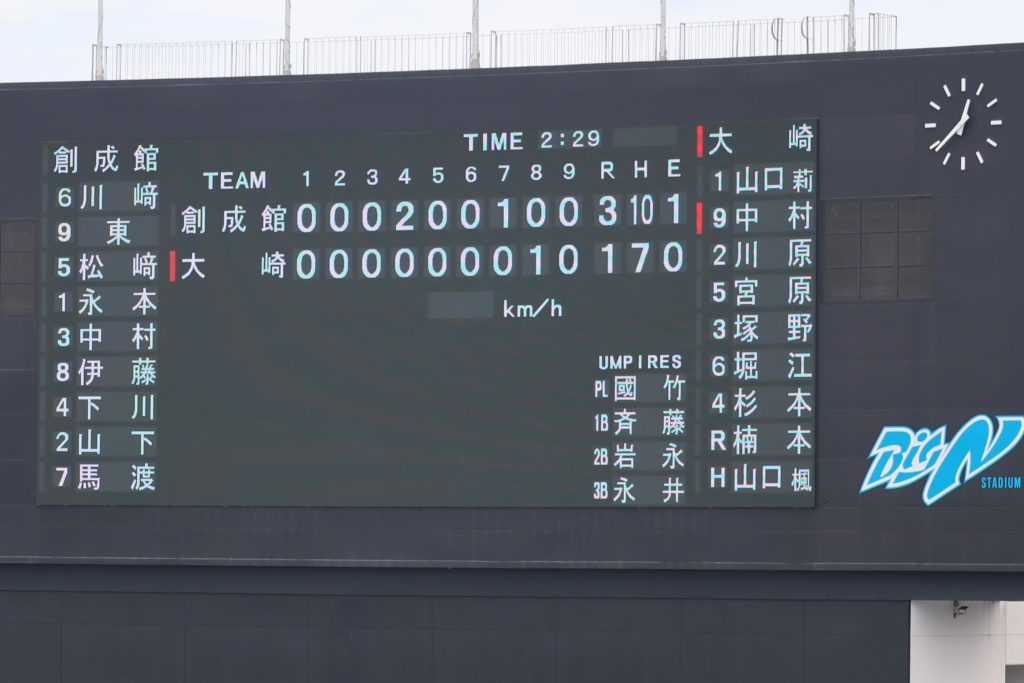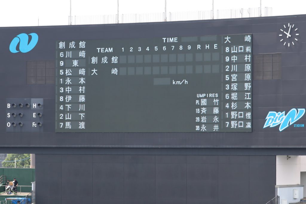 創成館 4回表の攻撃は二死一塁で、4番打者のタイムリーツーベースで先制し、続く5番打者の連打で2点目をあげ、2対0としました。 その後 7回の裏の攻撃は、8番打者の右中間ツーベースで一死二塁としました。ここで大崎は、先発 野口惺恩選手に代えて山口莉貢選手をマウンドに送りました。9番打者をセンターフライで打ち取り、二死二塁としましたが、1番打者にセンター前へはじき返され、3点目を献上してしまいました。