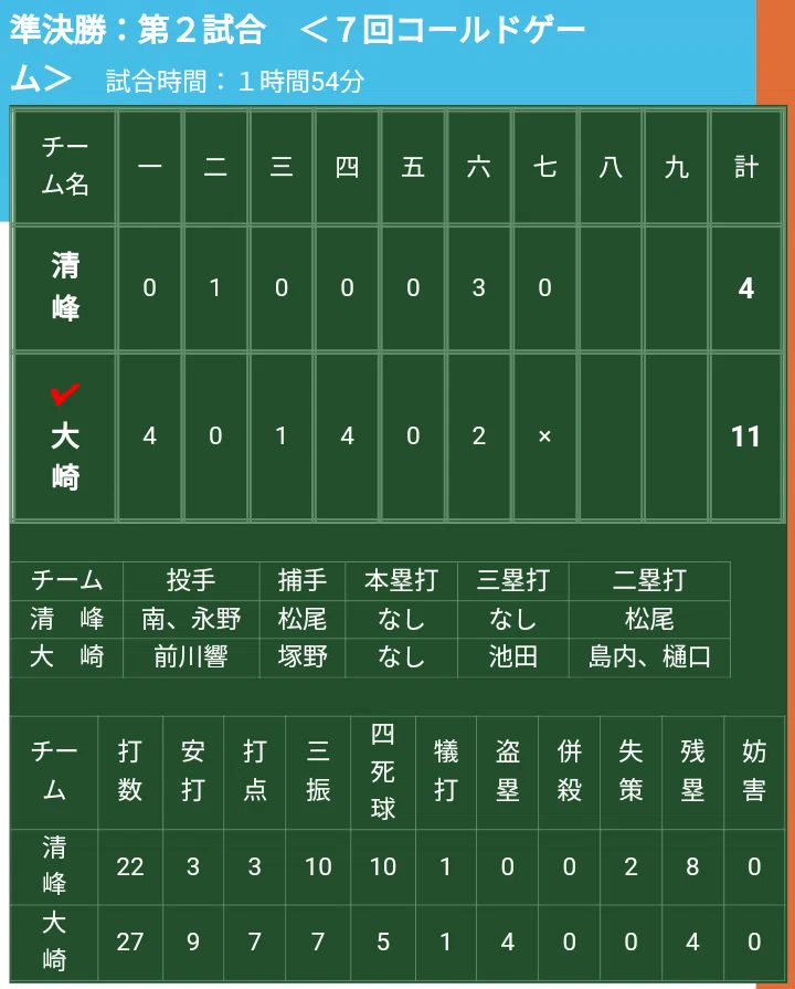 大 崎 11☓-4 清 峰 (7回コールドゲーム)