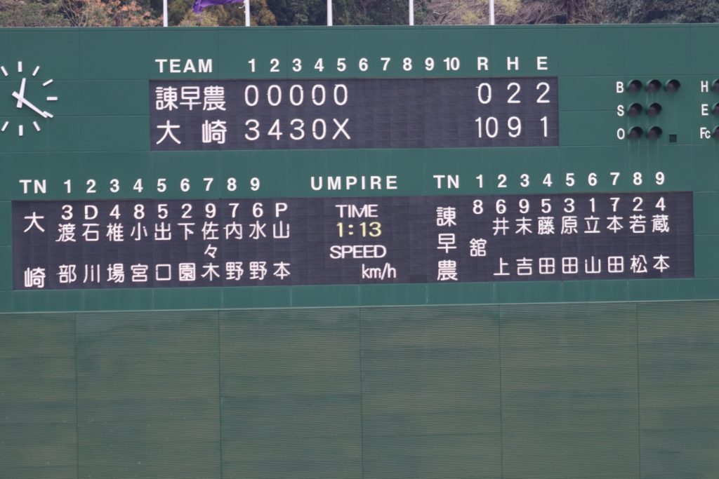大崎は諫早農業の2投手から9安打を放ち(内5安打が長打)5回までに大量10点をあげる